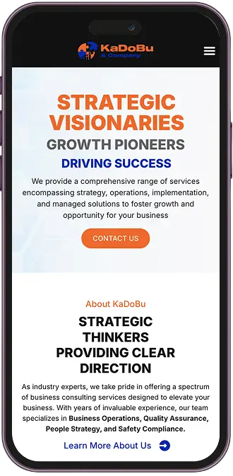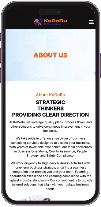 The KaDoBu website is structured to highlight its expertise in Business Operations, Quality Assurance, People Strategy, and Safety Compliance. It emphasizes tailored solutions, showcasing the company's commitment to operational excellence and strategic alignment with clients' long-term goals. The content is organized to build trust and communicate KaDoBu's approach to continuous improvement and risk management.