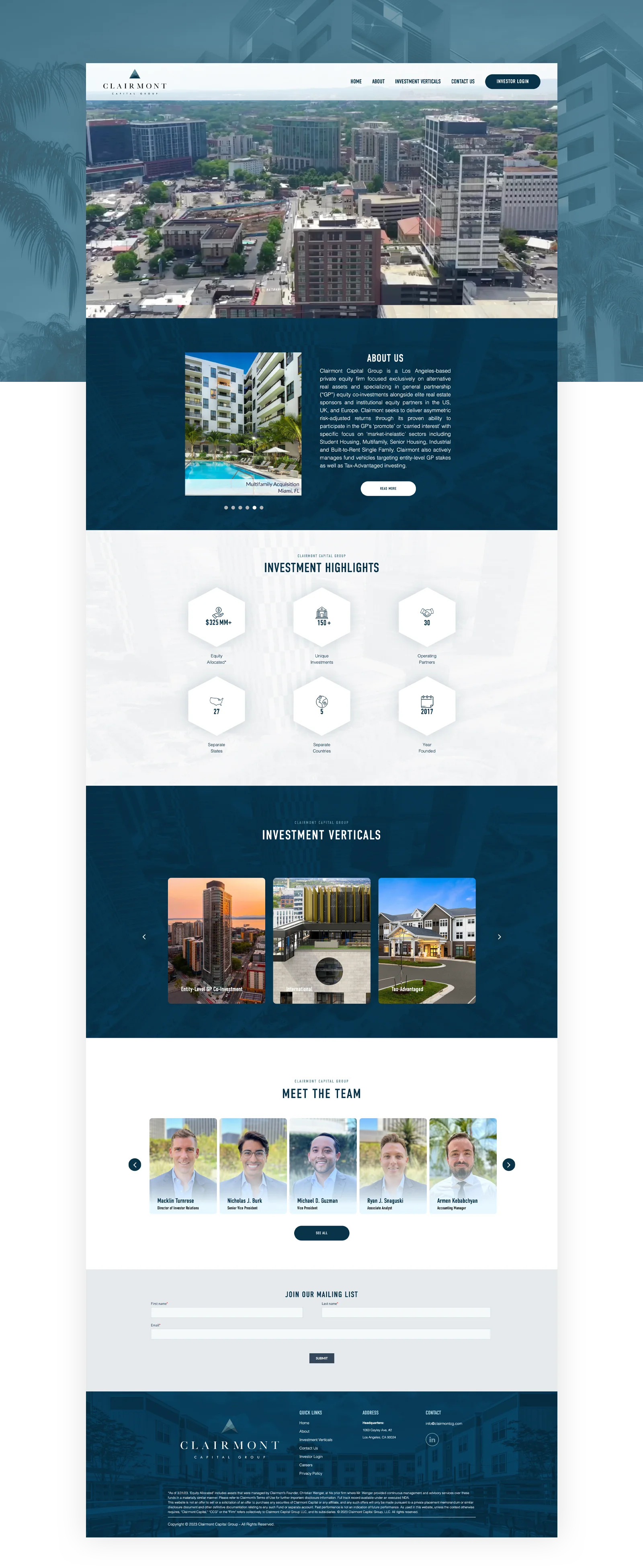Our first step was to elevate Clairmonts branding, creating a modern and sophisticated visual identity that aligned with their investment focus. We then designed a clean, straightforward website that makes it easy for visitors to understand Clairmonts expertise in GP equity co-investments and market-inelastic sectors. The sites design and layout ensure that users can easily find the information they need, whether theyre looking for sector details, investment strategies, or partnership opportunities. We also made sure the site was optimized for mobile and desktop use to provide a seamless experience